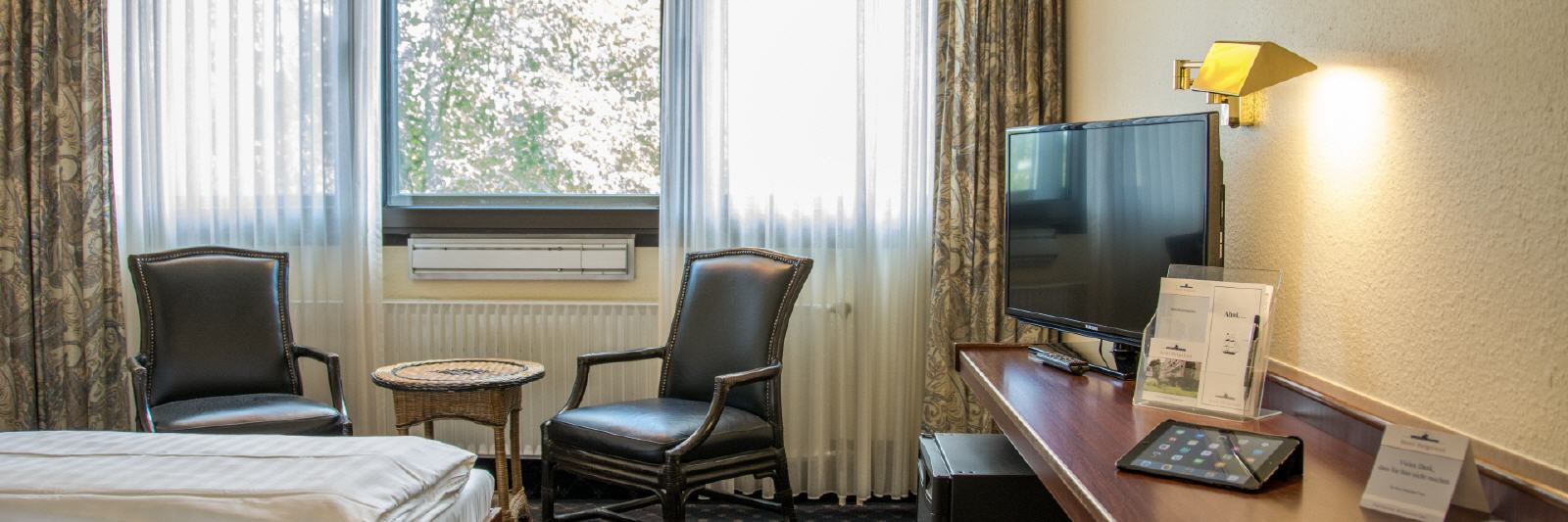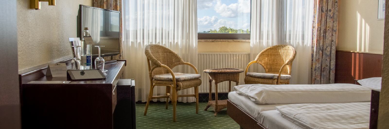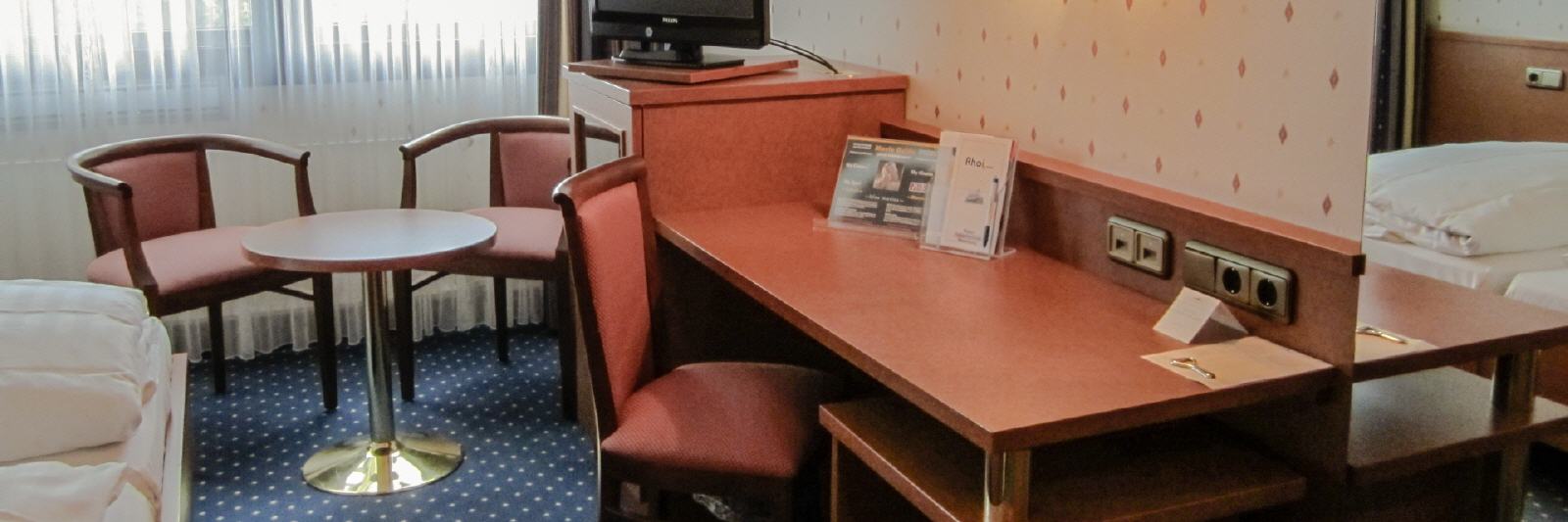 Alle Zimmer verfügen über ein eigenes Bad bzw. Dusche/WC. Auch ein TV mit SAT-Anschluss und ein Internetanschluss (z. B. für Ihren Laptop) gehören zur Ausstattung jedes Zimmers, ebenso eine Minibar.